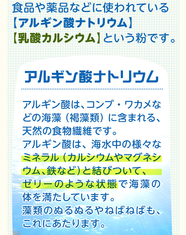 | 名 称 | アルギン酸ナトリウムと乳酸カルシウムのセット |