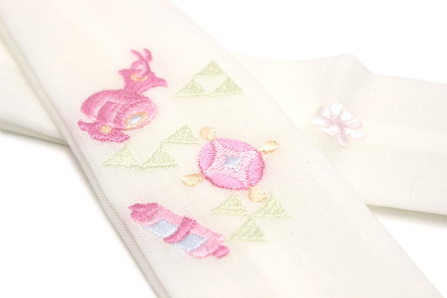 吸湿性に優れなじみ易い本モスリンに、宝尽くしの刺繍がされています。