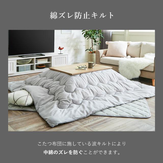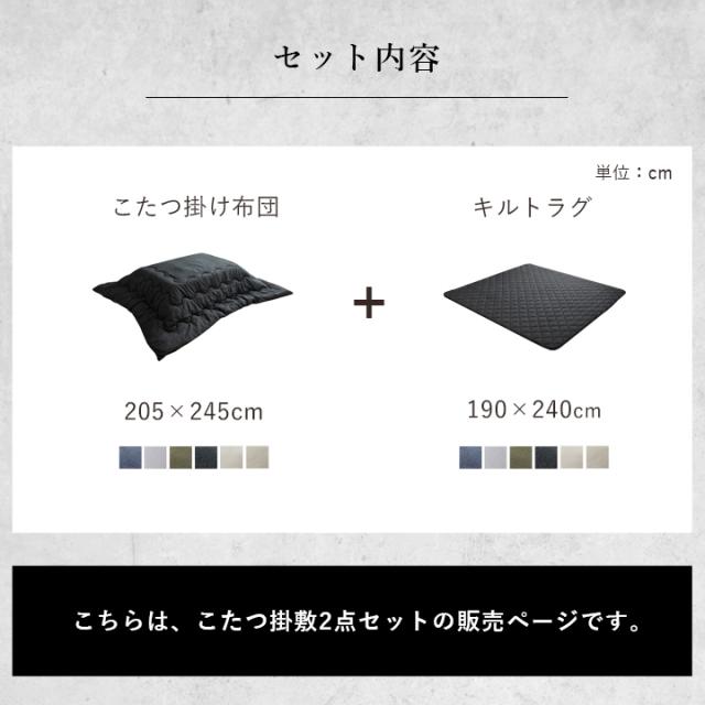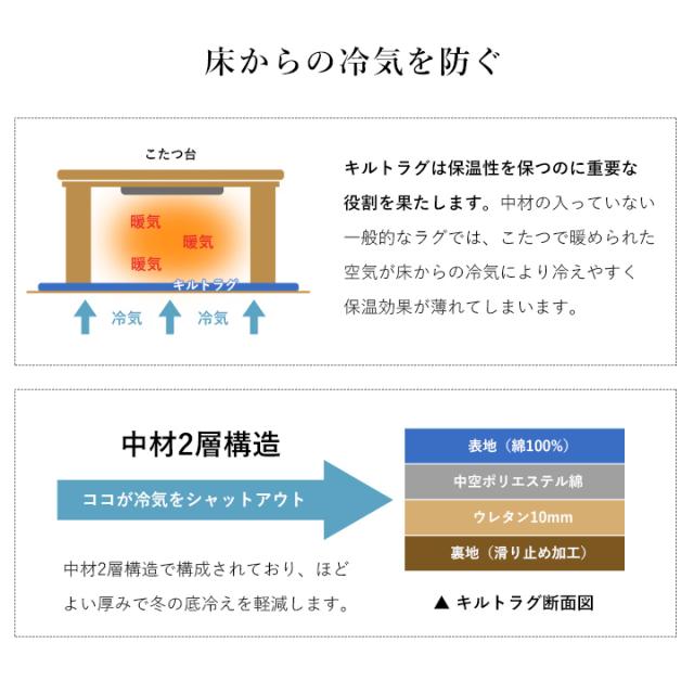 | 掛布団:約205×245cm キルトラグ:約190×240cm(約80〜90×120cm のこたつ台対応) ※キルティング加工許容範囲 +5%−3% |