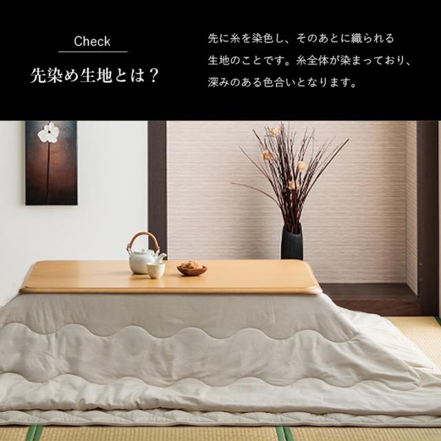 | ■ 大人気「先染めこたつ」シリーズ! ■ 豊富な柄、サイズで大人気のこたつ布団シリーズの2点セットです。 ■ 表地は、綿100%の先染め生地を使用しております。 ■ 掛け布団は裏地と表地の色味を合わせて更に重厚感あふれる雰囲気に仕上がりました。 ■ 綿ズレを防止するためのキルティングも施されておりますので、使い心地も抜群です。 ■ キルトラグは、「ウレタン」と「ポリエステルわた」の中材2層構造なので底つき感も軽減し快適なこたつライフを送れます。 |