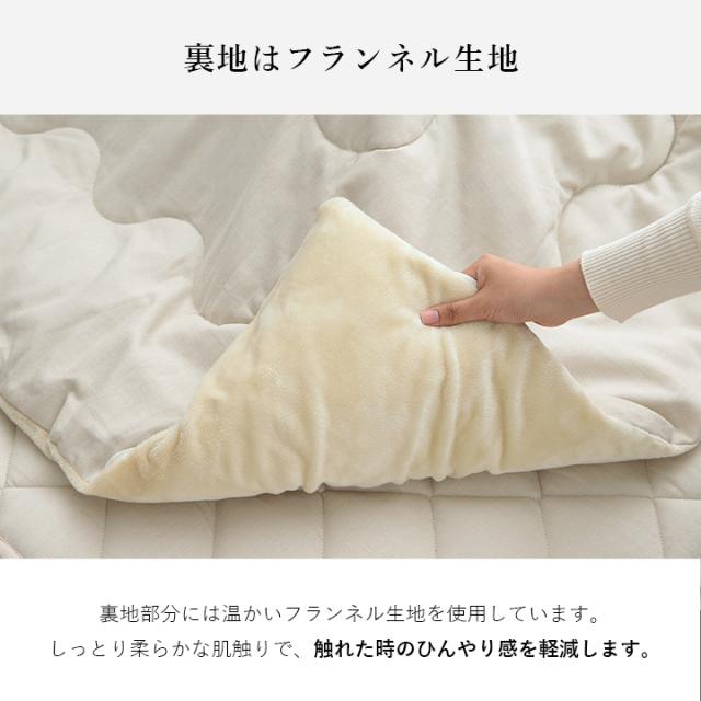 | 【掛布団】 表地=綿100% 裏地=ポリエステル100%(フランネル) 中材=ポリエステル綿100%(205×205cm:約1.25kg、205×245cm:約1.5kg) 【キルトラグ】 表地=綿100% 裏地=ポリプロピレン不織布100%(ドット滑り止め加工) 中材=(上層)中空ポリエステル綿100%(下層)ウレタンフォーム10mm |