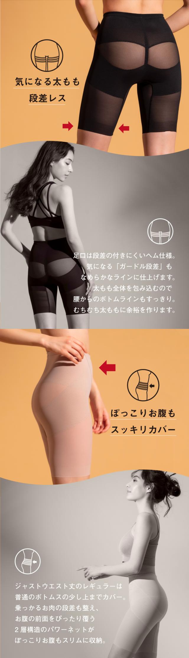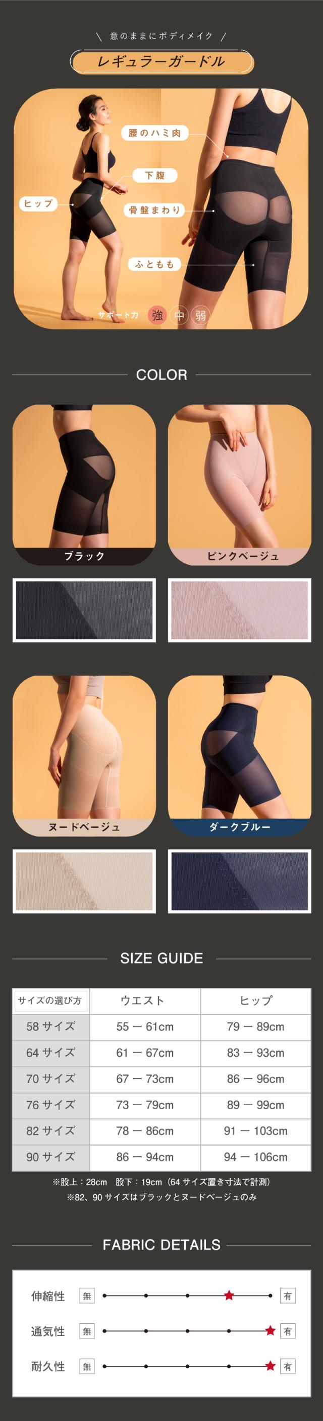 ■サイズ ・58サイズ ウエスト55-61cm、ヒップ79-89cm ・64サイズ ウエスト61-67cm、ヒップ83-93cm ・70サイズ ウエスト67-73cm、ヒップ86-96cm ・76サイズ ウエスト73-79cm、ヒップ89-99cm 82サイズ:ウエスト 78-86cm ヒップ 91-103cm 90サイズ:ウエスト 86-94cm ヒップ 94-106cm ※82,90サイズはブラックとヌードベージュのみ