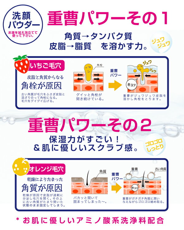 | 毛穴のトラブルにやさしく浸透する重曹パワー。角栓が原因のいちご毛穴には、 角質(タンパク質)や皮脂(脂質)を溶かしてツルツルな肌を目指します。 乾燥によりたまった角質が原因のオレンジ毛穴には、重曹スクラブで保湿&洗浄。 肌をいたわりながら、角質をゴロゴロとからめとります。 |