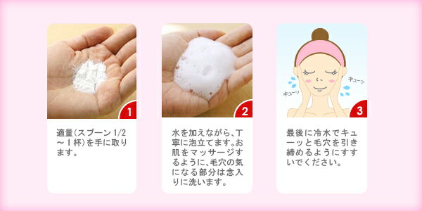 お肌のザラザラ、ボツボツが気になりだしたらぜひ重曹スクラブ洗顔を。パウダータイプの洗顔料で、スクラブ感を出すため泡立ちはおさえ気味ですが、泡が少ないと直接肌をゴシゴシこすってしまう原因に。水を加えながら丁寧に泡立てて、こすらずにすすぎ、肌をマッサージするようにご利用下さい。 |