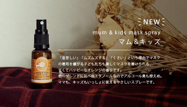 | 1年のうちにマスクをしている時って、けっこうあるかも。 そんなマスクにシュッとひと吹きするだけで、さわやかな香りが呼吸ををスーッと楽にしてくれるマスク用天然アロマスプレーです。 従来大人気の呼吸らくちんアロマ、「ブリーズイージー」、穏やかでフローラルな香りの「リラックス」に加え、ジューシーで甘いオレンジの香りがハッピーな「マム&キッズ」が新登場!香りに敏感な妊婦さんや刺激が気になるママ、子供たちのために、アルコール臭の元となるエタノールの配合量を最低限におさえたやさしいブレンドに仕上がっています。 絶妙にブレンドされたすっきり系天然アロマが、毎日のマスクをちょっと素敵なアイテムにランクアップ。 持ち運びしやすいコンパクトサイズなので、カバンに忍ばせていつでもどこでも連れていけます。 | |||