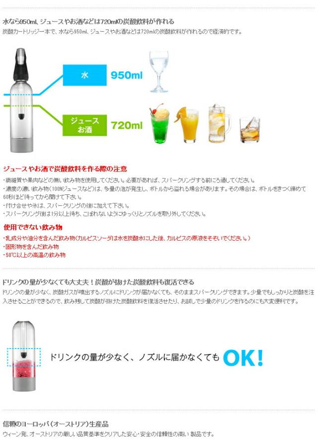 ・繊維質や果肉などの無い飲み物を使用してください。必要があれば、スパークリングする前にろ過してください。・濃度の濃い飲み物(100%ジュースなど)は、多量の泡が発生し、ボトルから溢れる場合があります。その場合は、ボトルをきつく締めて60秒ほど待ってから開けて下さい。・付け合せや氷は、スパークリングの後に加えて下さい。
