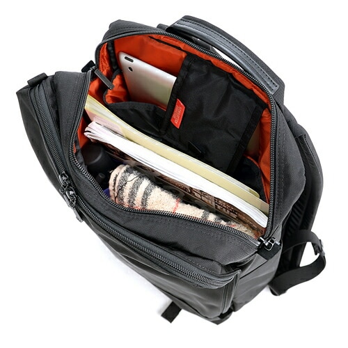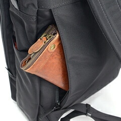 メインコンパートメントには緩衝パッド入りのPCポケットを併設。フロントのL字ファスナーを開くと3段式のオーガナイザーポケットを搭載していて、様々な小物をすっきりと収納できて素早く荷物にアクセス可能です。