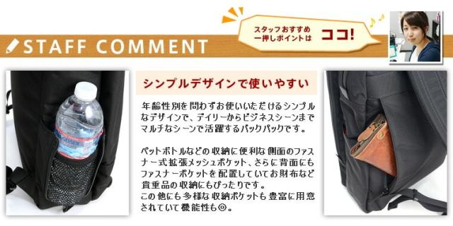 | 備考 | 【メイン開閉】ダブルファスナー 外側/ ファスナーポケット×2(うち1つは中にオープンポケット×6、ペン挿し×3、キーリング×1) オープンポケット×2(うち1つはファスナーでマチ拡張可) 内側/ オープンポケット×2 PC対応パッド入りポケット×1(A4対応) ※チェストベルト | ||