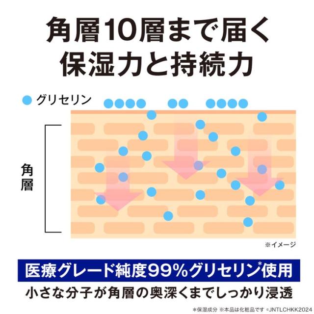 ●純度99%グリセリンが角層まで浸透し、1日中うるおいを持続し、肌を守ります。グリセリンは、自らの何倍もの水分を保持して、肌をうるおいで満たします。天然のグリセリンは、皮膚の角層にも存在し、角層内や肌表面にグリセリンを与えることで、肌の水分量を保つことができます。
