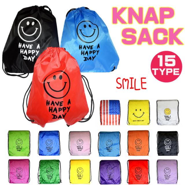 【2枚までメール便280円対応】ナップサック -01 スマイル ポーチ 買い物 バッグ エコバッグ 42×34cm knapsack 15種類 おもしろ雑貨 生活雑貨 カラフル ニコちゃん【キャラクター 軽量 収納 可愛い カバン キュート キッズ 通園 通学 A4サイズ】┃