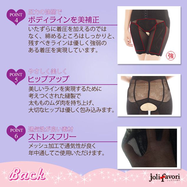 美しいラインを実現するために考えつくされた縫製で 太もものムダ肉を持ち上げ、大切なヒップは優しく包み込みます。