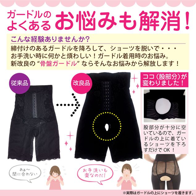 お手洗いの際にホックを外して、ガードルを降ろして...という作業不要の「お手洗い専用股あき」デザインになっています。