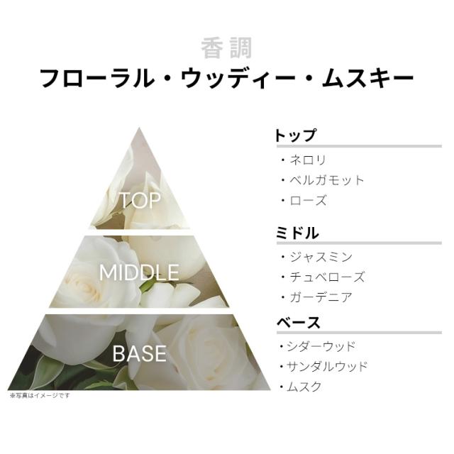 ネロリ、ベルガモット、ローズなどが、ソフィスティケートされた品のいいシトラス・フローラルを香り立たせるトップから、