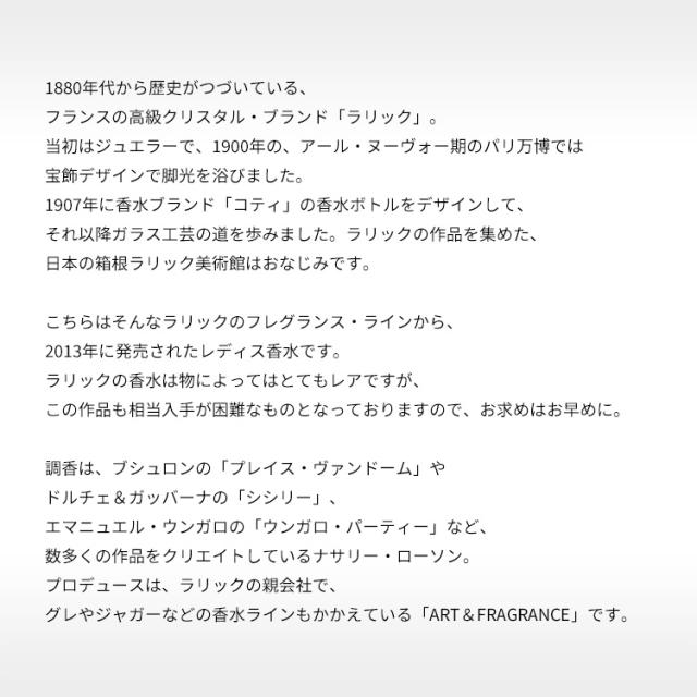 こちらはそんなラリックのフレグランス・ラインから、2013年に発売されたレディス香水です。ラリックの香水は物によってはとてもレアですが、この作品も相当入手が困難なものとなっておりますので、お求めはお早めに。香りは、シンプルでリリカルなトーンのフローラル・ウッディー・ムスキーの香調がベース。ハートフルでたおやかな情感の一品にしあげられております。