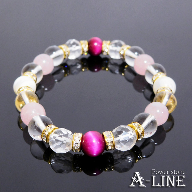 女性用:AAAピンクタイガーアイ&64面カットクリスタル&ローズクォーツ&マザーオブパール&水晶8mm・合金ロンデル・国産高級オペロンゴム