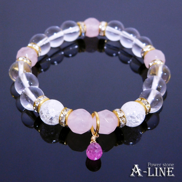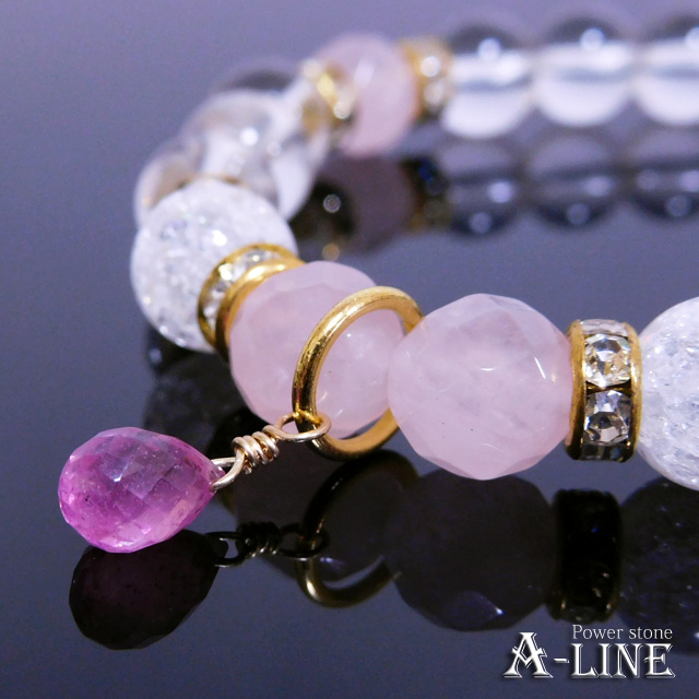 ルビーと同じコランダムグループの石になり、ブルーサファイアは青い物、ピンクサファイアはピンク色の物を指します。64面カット・ローズクォーツとクラッククリスタルを使い更に女性らしさをUPさせる組み合わせ♪