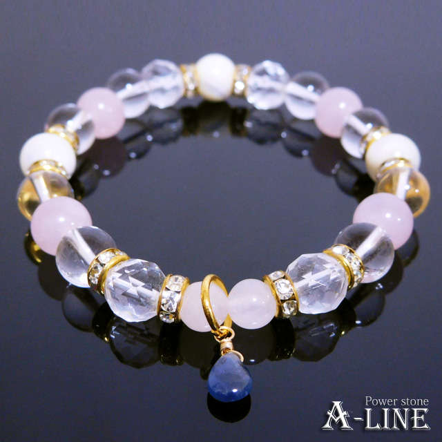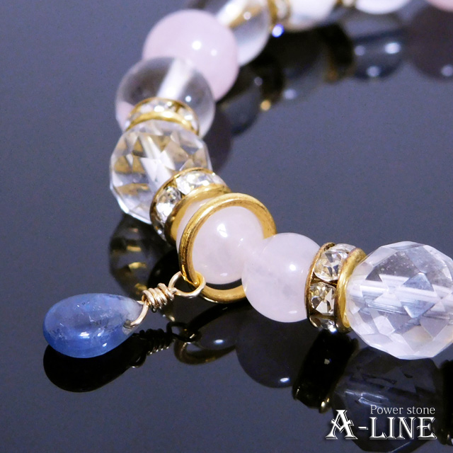ブルーサファイア(ワイヤー)・64面カットクリスタル&水晶&ローズクォーツ&マザーオブパール8mm・ローズクォーツ6mm・合金ロンデル・国産高級オペロンゴム