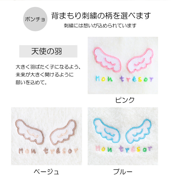 お風呂上がりやプールや水遊びに使える天使の背まもりベビーバスポンチョとかわいい天使の羽ネームタグが付いた天使の背まもりベビーリュックのセットです。