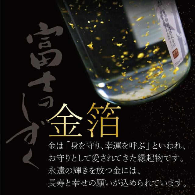 | サイズ・容量 | 【タンブラー】 直径7.5×高さ15.5cm 【富士のしずく】 ・製法/竹炭濾過 ・原材料名/米、米麹、金箔 ・内容量/720ml ・アルコール度数/25度 【桐箱】 縦32.8cm×横31cm×高さ11.5cm |