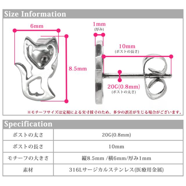 金属アレルギー対応 ステンレスピアス キャットモチーフピアス 両耳用 316L