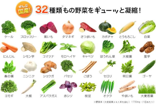 | 野菜末(ケール(国産)、ブロッコリー、紫いも、タマネギ、さつまいも、カボチャ、とうもろこし、白菜、にんじん、シモン芋、コマツナ、モロヘイヤ、キャベツ、ほうれん草、大根葉、里芋、桑の葉、ニンニク、ショウガ、パセリ、ごぼう、セロリ、明日葉、ゴーヤ、ヨモギ、大根、アスパラガス、赤シソ、枝豆(大豆)、オクラ、やまいも)、大麦若葉エキス末、難消化性デキストリン、乳酸菌・酵母醗酵殺菌粉末(乳成分を含む)/セルロース、グリセリン脂肪酸エステル、微粒二酸化ケイ素、ビタミンE |