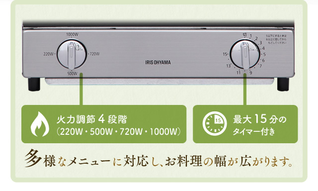 4段階火力調節・縦型は3段階火力調節ができ、多様なメニューに対応します。