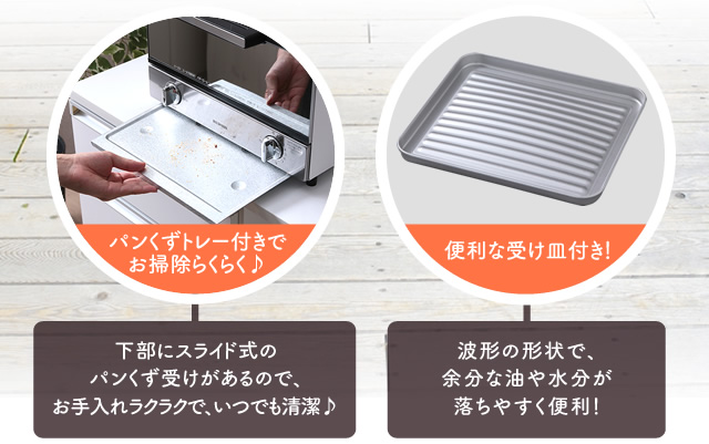 調理に便利な受け皿、お手入れしやすいパンくずトレー付きです。