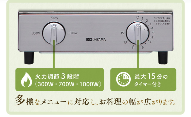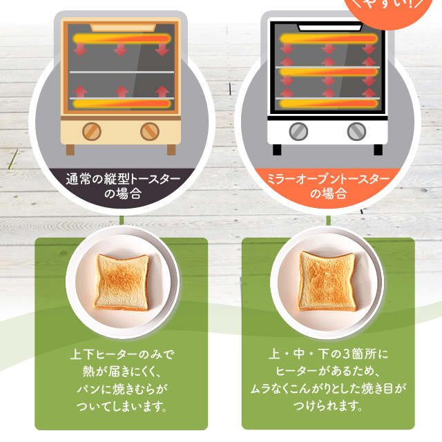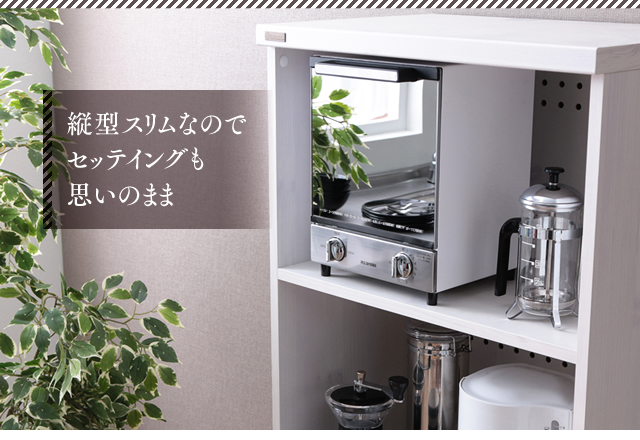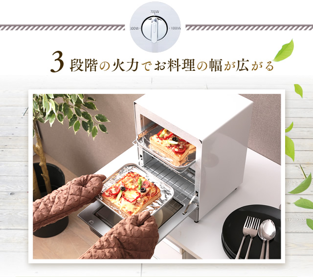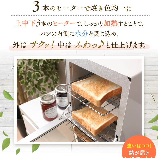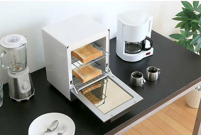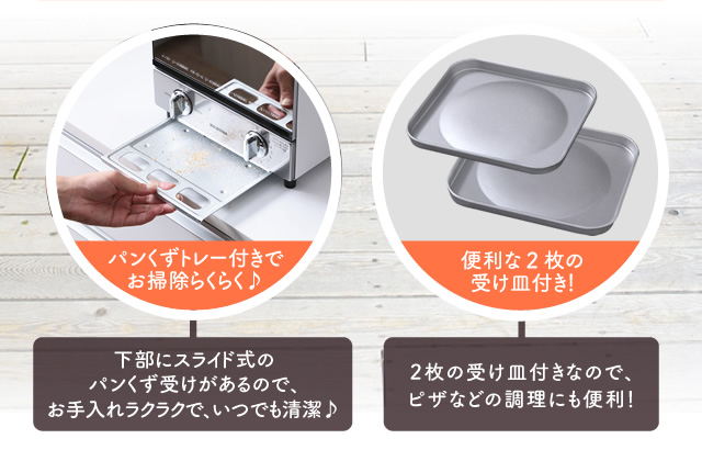 スリムタイプで置き場所を選ばず、上・中・下の3本のヒーターで2つの調理が同時にできる2段式です。調理に便利な受け皿、お手入れしやすいパンくずトレー付きです。