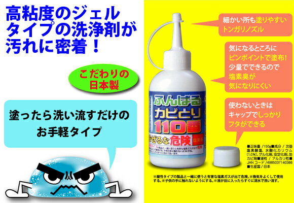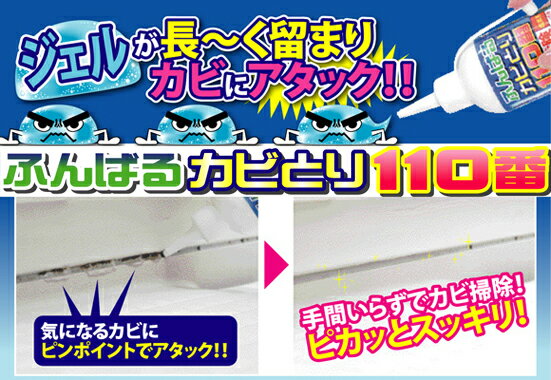 部分的なカビに高粘度のジェルタイプの洗浄剤が汚れに密着、長〜く留まりアタック!液ダレしにくく、垂直面のカビもしっかり包んで落とします。発生し始めたカビにピンポイントで密着塗布!塗ったら洗い流すだけのお手軽タイプです。取れにくいシリコンパッキンの部分のカビ汚れにも対応。目地に塗りやすいトンガリノズル付き。使わないときは付属キャップでしっかりフタができ、ジェル漏れの心配がありません。【商品名】ふんばるカビとり110番【材質】次亜塩素酸塩、水酸化カリウム(1.0%)、ゲル化剤、安定化剤、防カビ剤【生産国】日本【個装サイズ】6×4.4×17.1cm【個装重量】200 g【備考】■正味量/150g■液性/アルカリ性■使用量の目安/1mあたり5g ※ホーロー・アルミニウム・真鍮などの金属製品・砂壁・繊維壁・漆喰壁・クロス壁・木製品・大理石には使用しないで下さい。※酸性タイプの製品と一緒に使うと有毒な塩素ガスが出て危険。換気をよくして使用して下さい。※お子様の手に触れないようにして下さい。※液が目に入ったらすぐに流水で洗い流して下さい。