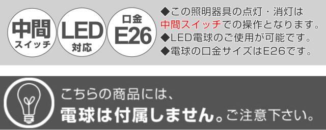 | 備考 | 【対応電球】 E26/60Wまで(1個) LED・蛍光灯・白熱球使用可能 【点灯方法】 中間スイッチ |