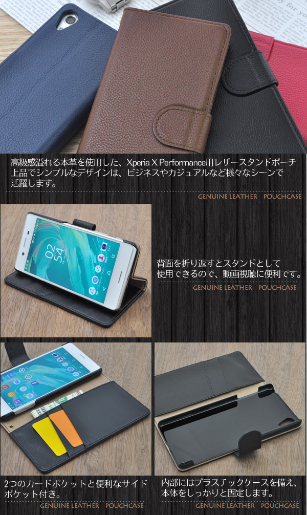 高級感溢れる本革を使用した、Xperia X Performance用レザースタンドポーチケース。 上品でシンプルなデザインは、ビジネスやカジュアルなど様々なシーンで活躍します。また、内部にはプラスチックケースを備え、本体をしっかりと固定します。※Xperia X Performanceは付属しません。※ライセンス商品ではありません ※カードは付属しません。 ※ケースをつけたまま撮影できますが、フラッシュ撮影時にケースの色が移り込むことがあります。