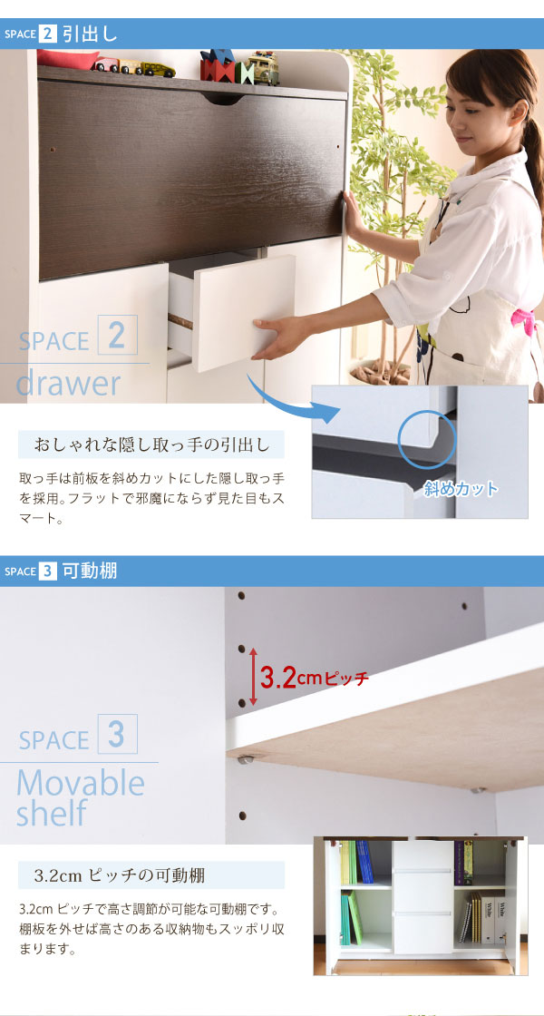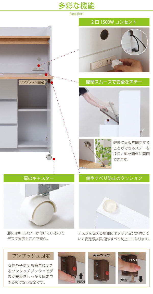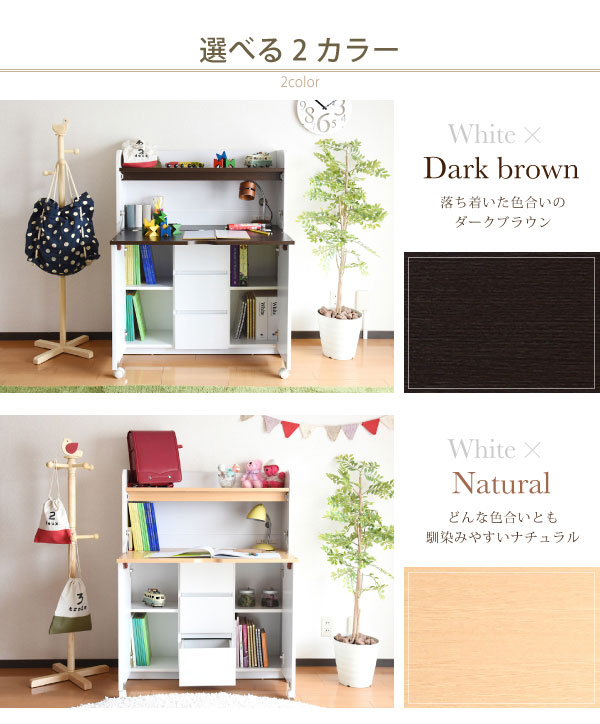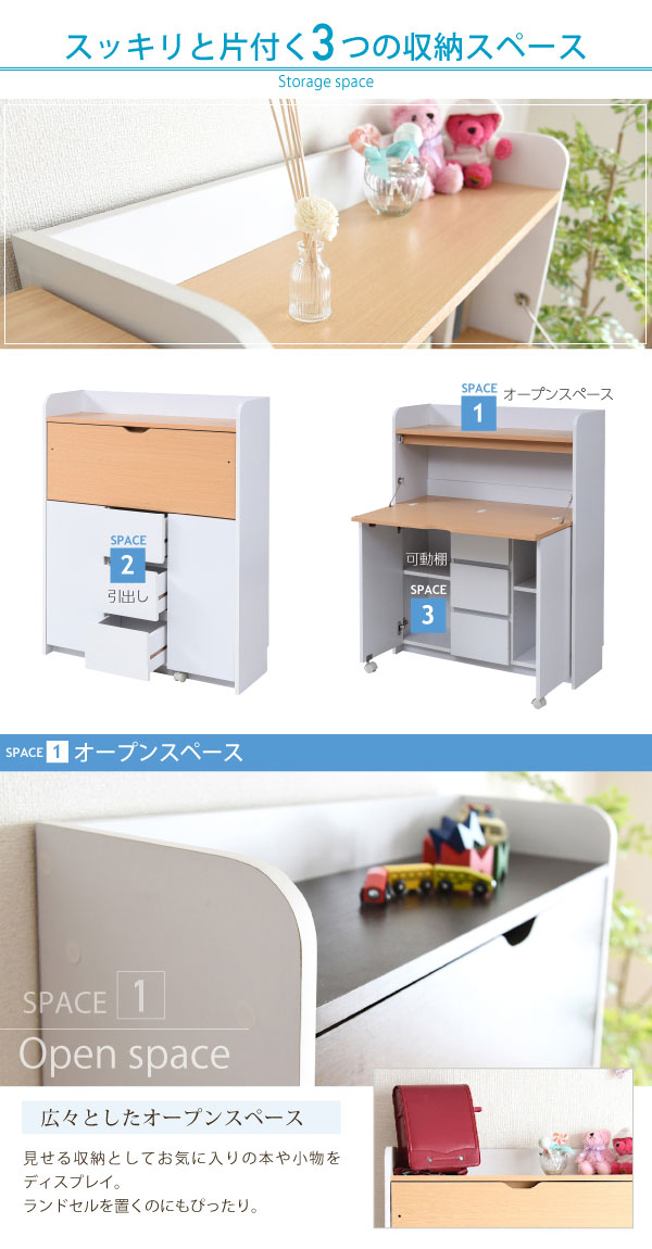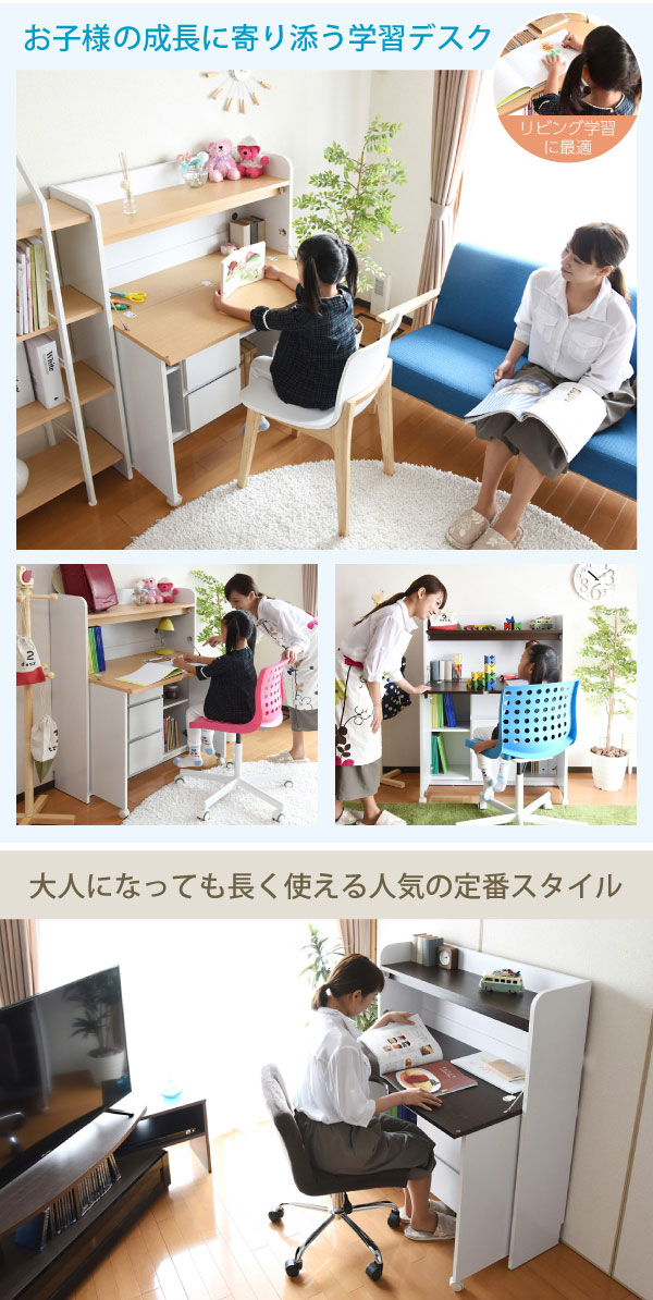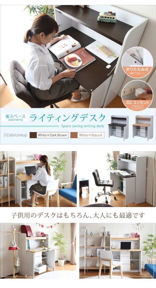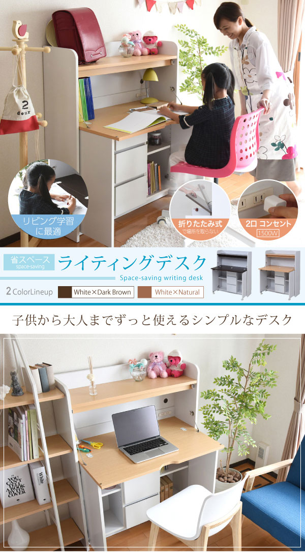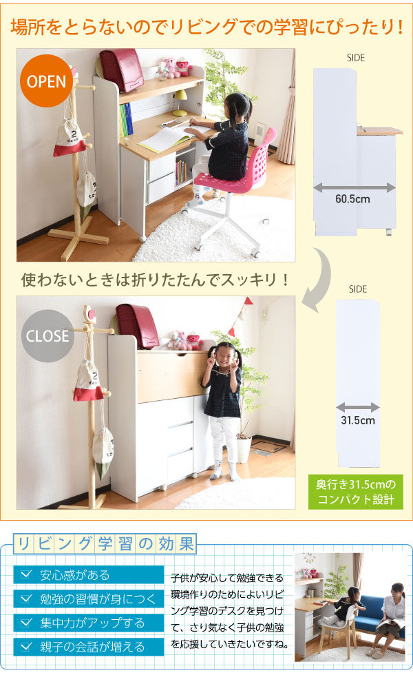 折り畳み式天板で、使いたいときだけ広げて、使わない時はすっきり畳んでおける、ライティングデスク。しかも薄型だからリビングに最適。リビングでの子供の学習から、ママやパパのパソコンデスクとしても。上部にはランドセルなどを置けるオープン収納部、下部には扉収納部と3段の引出しで、収納力にも自信あり。コンセント、配線コード穴もあるので、PC、周辺機器の設置もOKです。