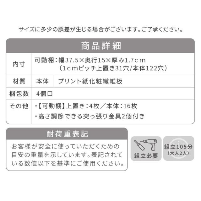 (可動棚)幅37.5×奥行15.0×厚み1.7cm(1cmピッチ上下各61穴)