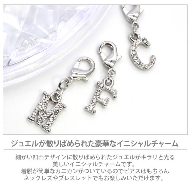 細かい凹凸の中に散りばめられたジュエルがキラリと光るゴージャスなイニシャルチャームです。カニカンは付け外しがとても簡単なので、ピアス、ネックレス、ブレスレット、キーホルダーなどに付け替えて、ご自身によるカスタマイズをお楽しみください。