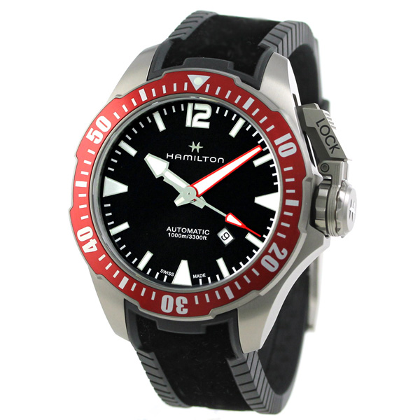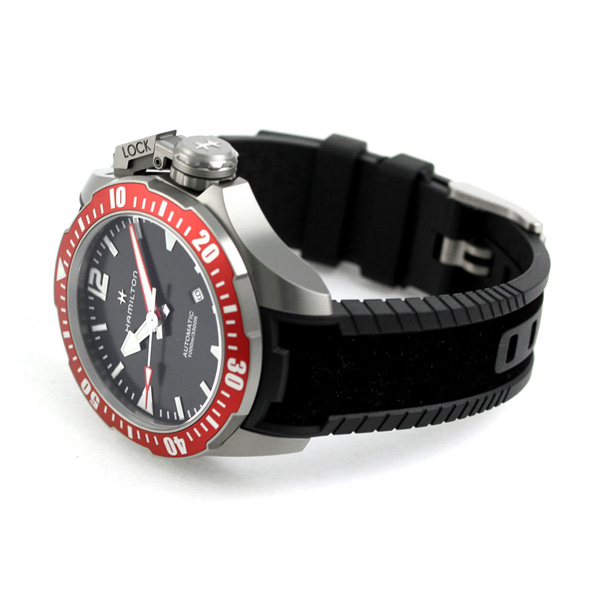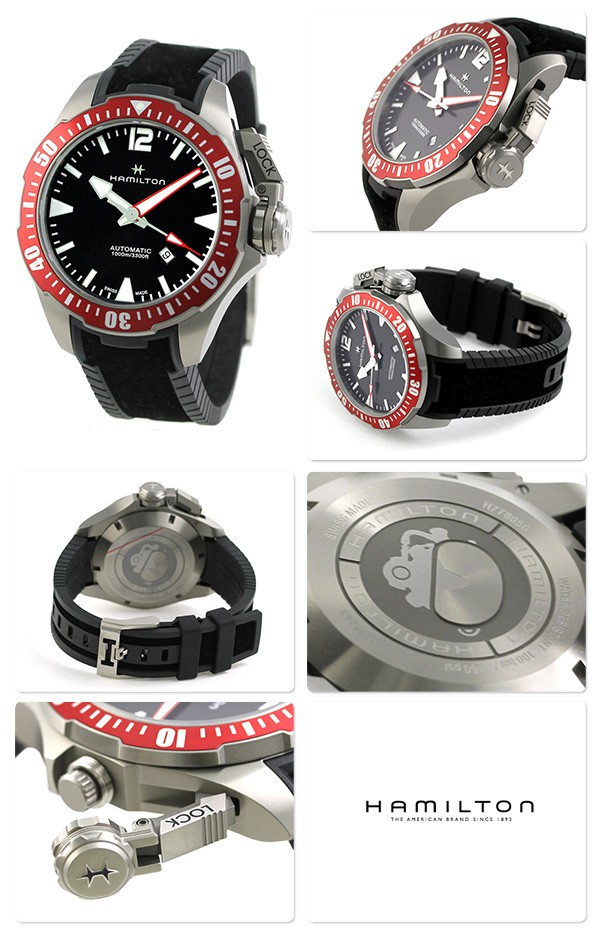 3年保証キャンペーン ハミルトン ダイバーズ カーキ ネイビー オープン ウォーター オート 46mm スイス製 自動巻き メンズ 腕時計 HAMILTON KHAKI NAVY OPEN WATER AUTO 46mm H77805335 アナログ ブラック ◆HAMILTON(ハミルトン)はアメリカ発祥の老舗ブランドです。創業翌年に誕生した懐中時計「ブロードウェイ・リミテッド」は、他の時計よりも正確に時を刻むことから鉄道用時計として採用されました。その後も航空用時計や軍用時計として採用されるなど、品質の高さと流行にながされない独自のデザインが世界中の人々に支持されています。 1951年の名作映画・フロッグメンに登場した潜水時計からインスピレーションを受けてつくられた腕時計。スクリュー式リューズカバーを採用した、本格ダイバーズウォッチです。100気圧防水を搭載、10時位置にはヘリウムガスエスケープバルブ付き。針に施されたレッドカラーがアクセントに。 機械式腕時計