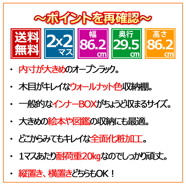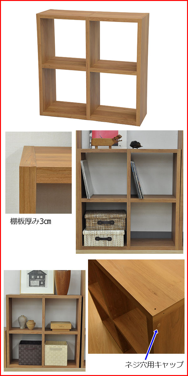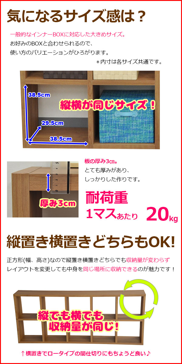 ・内寸は一般的なインナーBOXに対応した大きめサイズ。お好みのBOXと合わせられるので、使い方のバリエーションがひろがります。 ・また内寸は正方形(幅、高さ)なので縦置き横置きどちらでも収納量が変わらず、レイアウトを変更しても中身を同じ場所に収納できるのが魅力的です。 ・板の厚みは3cm。とても厚みがありしっかりした作りです。 ・1マスあたりの耐荷重も20kgあるのでしっかり頑丈です。 ・どこから見てもキレイな全面化粧加工です。 |