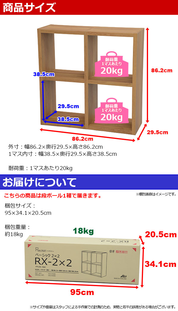 外寸:幅86.2cm 奥行き29.5cm 高さ86.2cm 1マス内寸:幅38.5cm 奥行き29.5cm 高さ38.5cm |