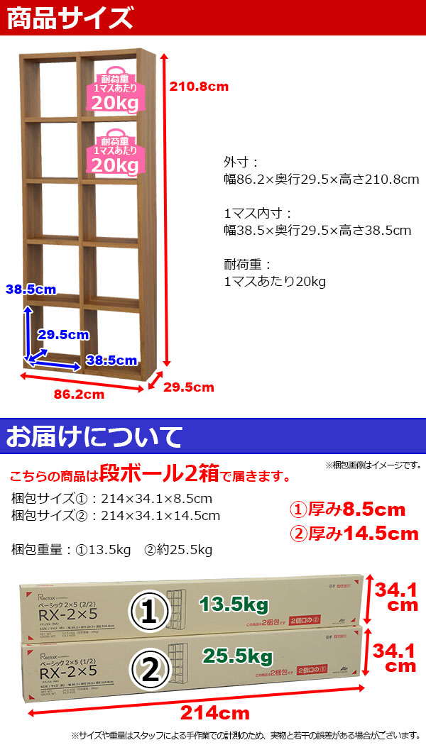 外寸:幅86.2cm 奥行き29.5cm 高さ210.8cm 1マス内寸:幅38.5cm 奥行き29.5cm 高さ38.5cm |