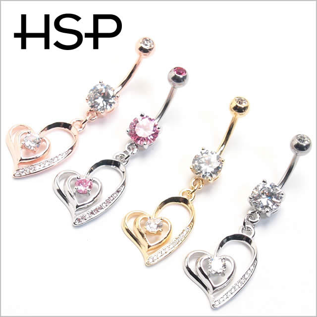 ダブルハートダングル バナナバーベル ボディピアス 【 イエローゴールド シルバー ピンクゴールド 】