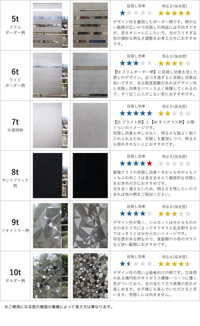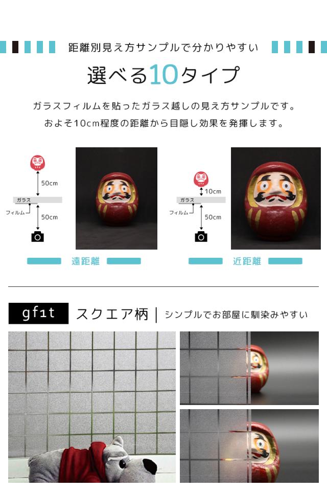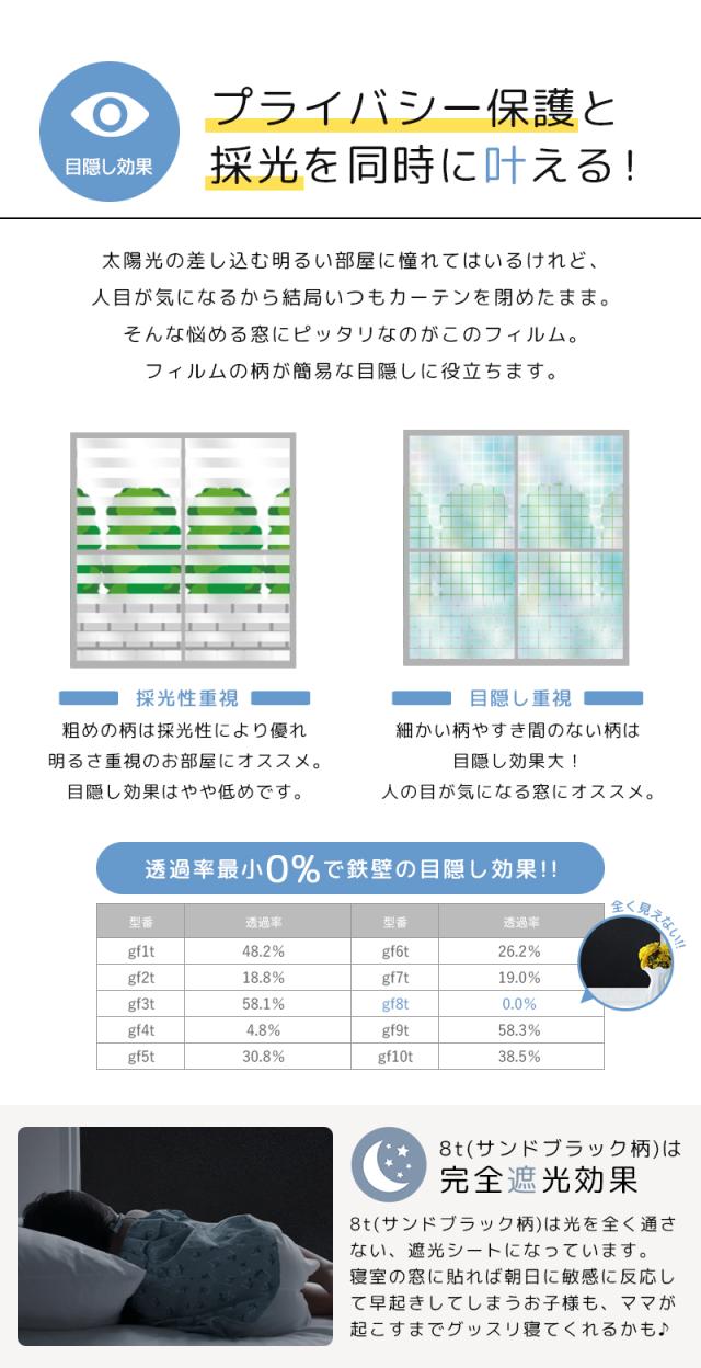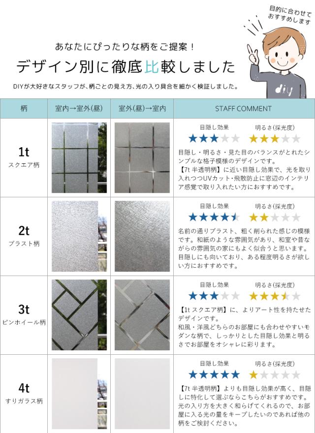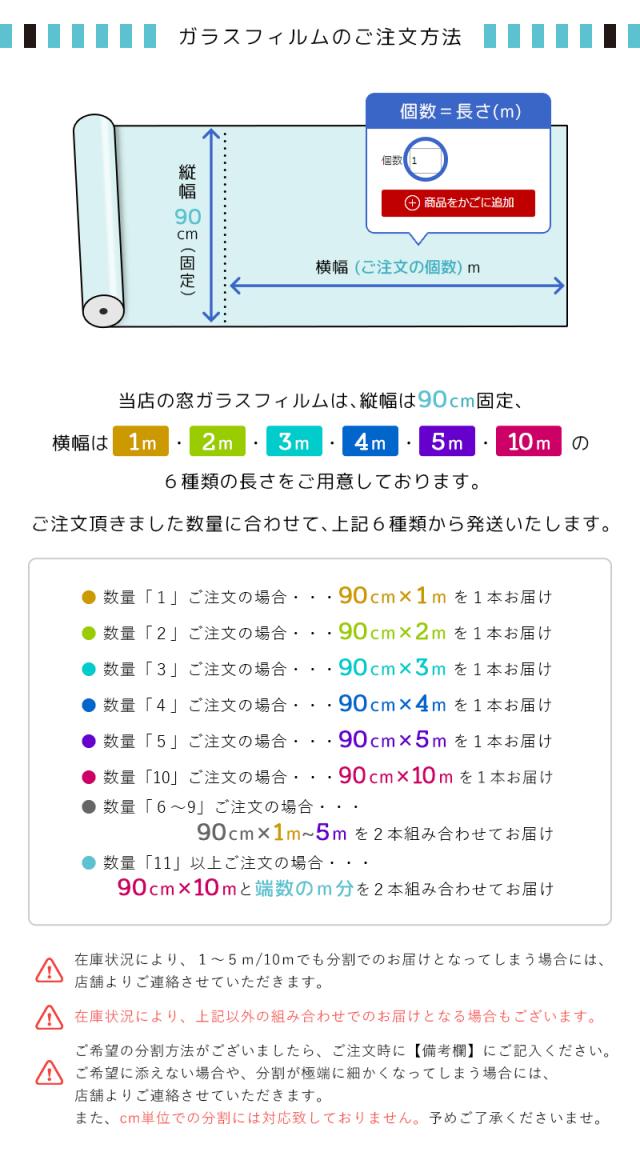 | 商品詳細 | 当店の窓ガラスフィルムは、縦幅は90cm固定、 横幅は 1m ・ 2m ・ 3m ・ 4m ・ 5m ・ 10m の 6種類の長さをご用意しております。 ご注文頂きました数量に合わせて、上記6種類から発送いたします。 〇 数量「1」ご注文の場合・・・90cm×1m を1本お届け 〇 数量「2」ご注文の場合・・・90cm×2m を1本お届け 〇 数量「3」ご注文の場合・・・90cm×3m を1本お届け 〇 数量「4」ご注文の場合・・・90cm×4m を1本お届け 〇 数量「5」ご注文の場合・・・90cm×5m を1本お届け 〇 数量「10」ご注文の場合・・・90cm×10m を1本お届け 〇 数量「6〜9」ご注文の場合・・・ 90cm×1m~5m を2本組み合わせてお届け 〇 数量「11」以上ご注文の場合・・・ 90cm×10mと端数のm分を2本組み合わせてお届け ※cm単位でのカットには対応致しておりません。 〇カラー:選べる10タイプ〇 ・1tスクエア柄【シンプルでお部屋に馴染みやすい】 ・2tブラスト柄【プライバシー保護・目隠しに】 ・3tピンホイール柄【モダンな雰囲気を演出】 ・4tすりガラス柄【覗き見防止効果抜群のホワイトガラス】 ・5tスリムボーダー柄【光を上手に取り入れる】 ・6tワイドボーダー柄【スタイリッシュな空間に】 ・7t半透明柄【絶妙な質感で上品な窓ガラスに】 ・8tサンドブラック柄【最強の目隠し効果!!】 ・9tジオメトリー柄【気品漂うプリズム調】 ・10tボルダー柄【光の反射で楽しい窓辺に】 ■紫外線カット率■ ・1t 81.60% ・2t 90.10% ・3t 85.80% ・4t 99.70% ・5t 88.60% ・6t 89.10% ・7t 90.30% ・8t 100% ・9t 75.20% ・10t 68.10% 【お客様の声をもとにバージョンアップ!】 剥離フィルムに方眼メモリがついて、カットしやすくなりました! |