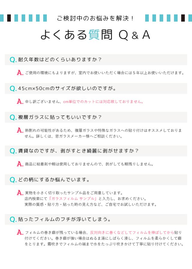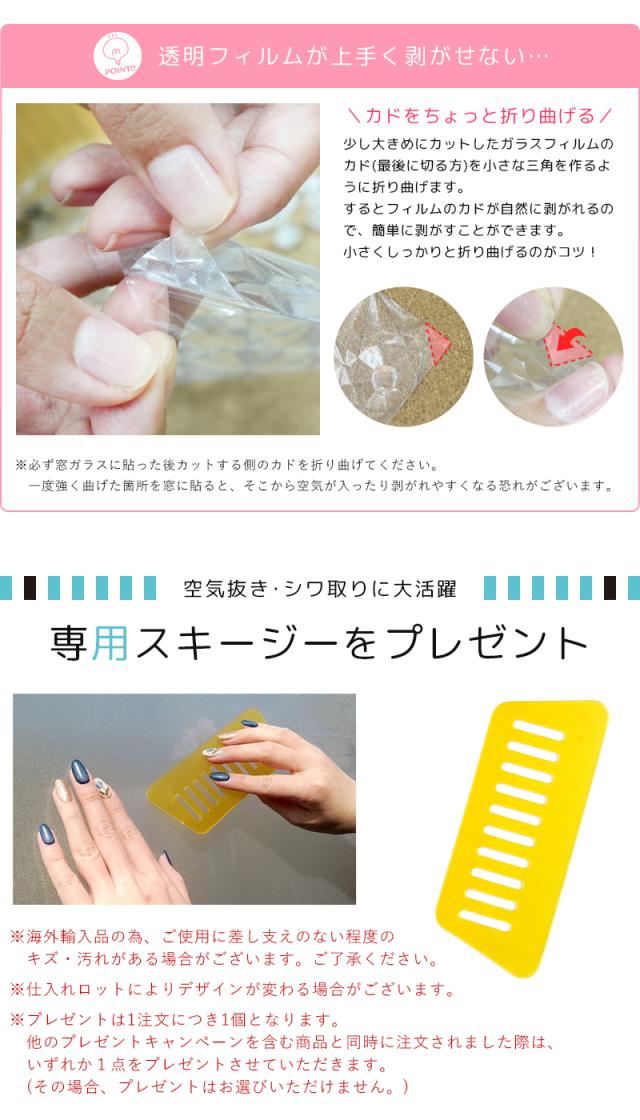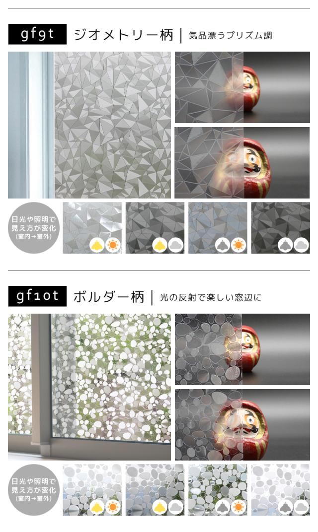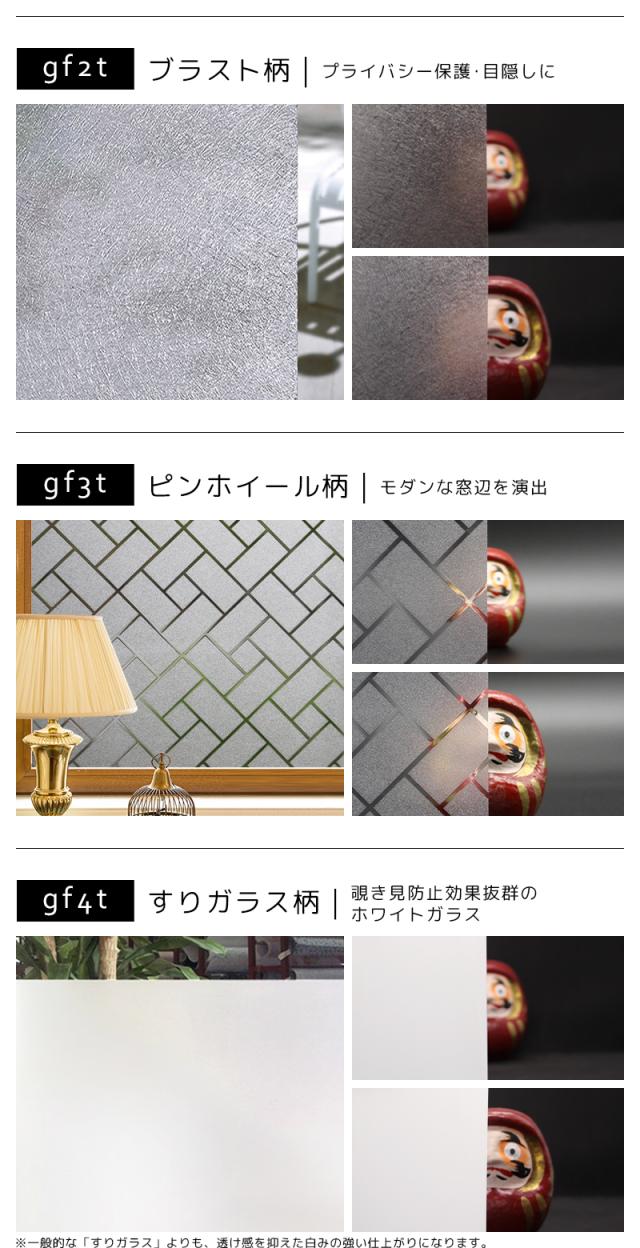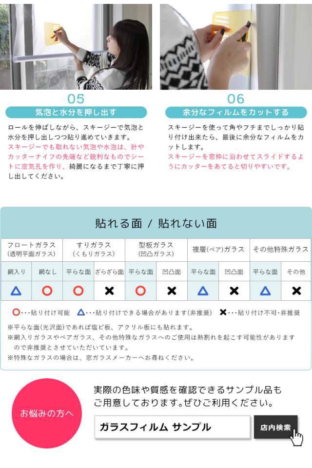 | 注意事項 | ●ご使用の環境によって、接着しにくい場合があります。 ●なるべく平らなガラスにご使用下さい。 ●ざらざらした壁、凹凸面にはご使用になれません。 ●フィルムは貼り直しができますが、何度も繰り返すと粘着力が弱まります。 ●熱割れの可能性があるため、複層ガラスや特殊なガラスへの貼り付けはオススメしておりません。 詳しくは、窓ガラスメーカー様へご相談ください。 |