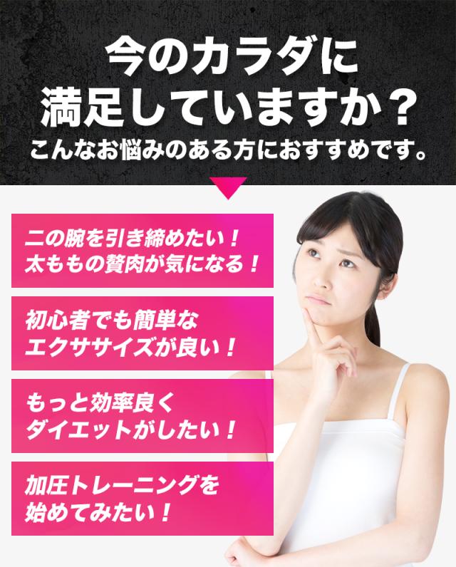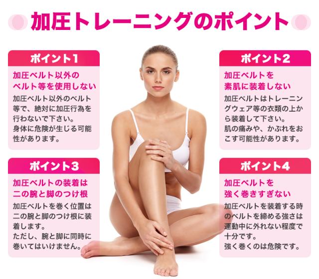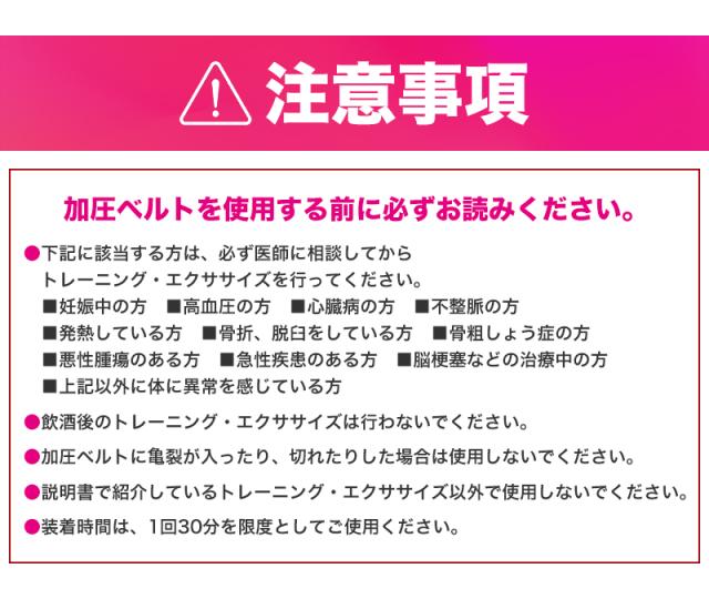 | 注意事項 | 【エクササイズを安全に行う為に必ず守ってください。】 使用に関して危険性の管理は自己責任の下で行い、 怪我等の事故が発生しても当社は一切の責任を 負いかねますのでご了承下さい。 ●加圧ベルトを腕と脚を同時に巻いての運動は止めて下さい。 腕のみ、脚のみで運動を行って下さい。 ●加圧ベルトを巻いた状態で手脚が痺れた状態で 行わないで下さい(圧力が強すぎます) 手脚が赤みを帯びた状態が適正です。 ●加圧ベルトを巻いた状態で運動を 15分以上行わないで下さい。 15分以上行う場合は、必ず徐圧 (ベルトを一時外し血液を流す)して下さい。 ●疾患がある方やリハビリの目的で使用する方が 使用する場合は事前に医師にご相談下さい。 また、運動中に異常を感じたら、直ちに使用を中止し 専門家に適切なアドバイスを仰ぎましょう。 ●下肢静脈瘤の方はご使用しないでください。 |