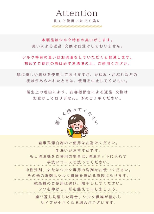 | 注意事項 | ●お肌に合わない場合や、湿疹・傷・かぶれ等のある場合、かゆみ等がでた場合はご使用にならないでください。 ●火気のそばや高温多湿な場所、直射日光の当たる場所には保管しないでください。 ●本来の目的以外でのご使用はおやめください。 ●生地部分に爪を立て、無理に引っ張ると破れるおそれがあります。着脱の際はご注意ください。 ●天然素材を使用しておりますので、シルクの特有の匂いがする場合がございます。 匂いによる返品・交換はお受けしておりません。匂いが気になる場合はお洗濯の上、ご使用ください。 |