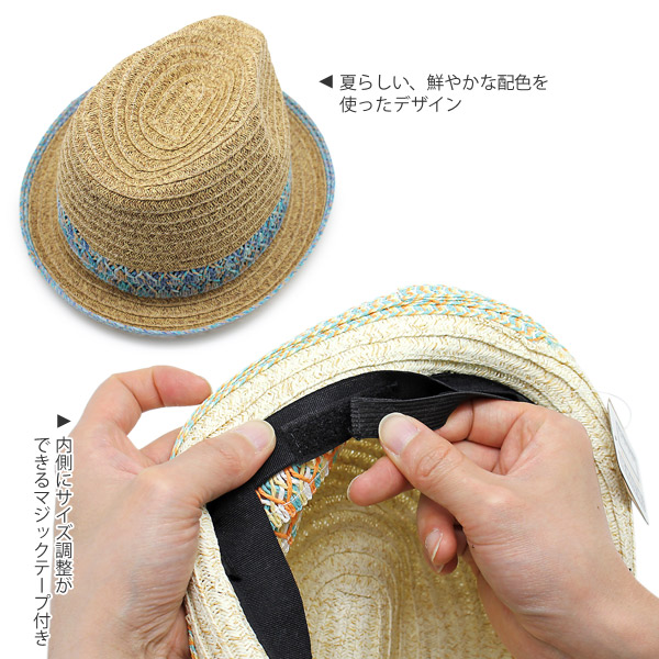 爽やかな色使いで涼しい印象をあたえてくれる麦わら帽子。なんといっても最大の特徴は、帯の部分です!普通はリボンなどを巻くのですが、このハットは本体と同じ素材(指定外繊維)を使い、さらに配色にもこだわったデザインになっています。キッズにはお洒落すぎるくらいアクセントとして映えること間違いなし♪太陽に似合う色合いで夏を満喫できるヘビロテアイテムになりますよ☆また、スベリ部分の内側には、サイズ調整が可能なマジックテープ&ゴムが付いています。