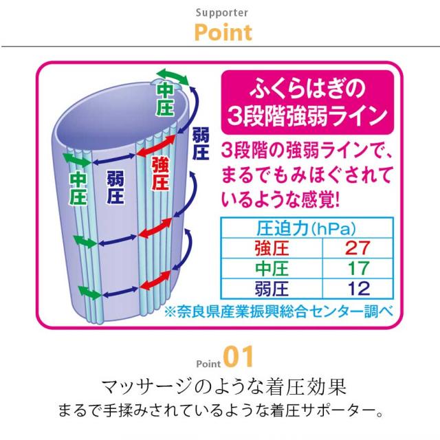 下から上への段階的な着圧と、ふくらはぎの3段階強弱ラインがまるで手もみマッサージのような着圧効果を脚に与えます。