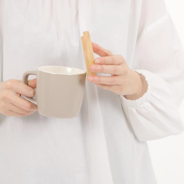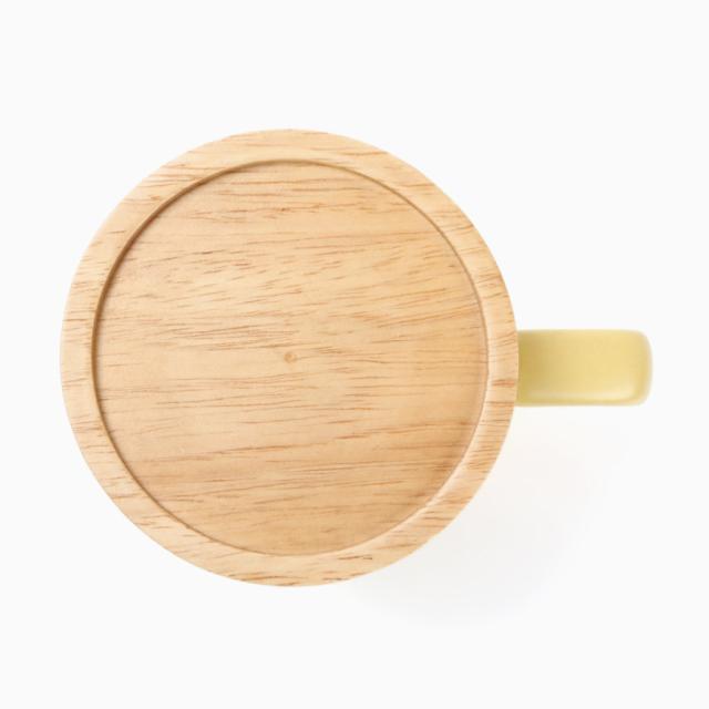ウッドのソーサーとセットになったコーヒーマグ。ソーサーはふたにもなるスグレモノ。
