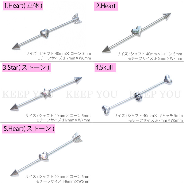 【メール便対応】ボディピアス ロングストレートバーベル 星 ハート スカル モチーフ 16G(1.2mm) 14G(1.6mm) サージカルステンレス316L モチーフ 16ゲージ 14ゲージ┃