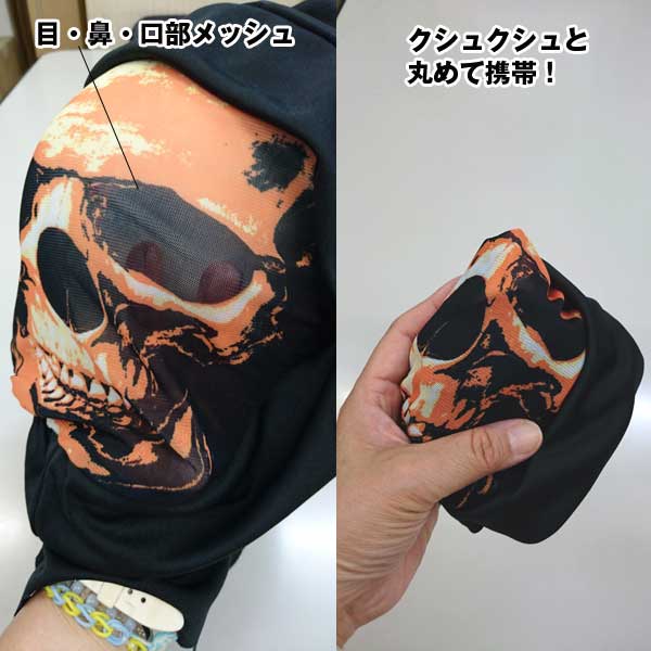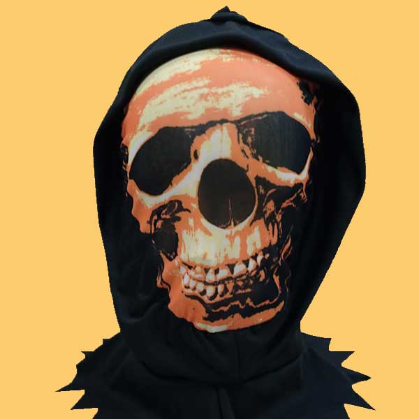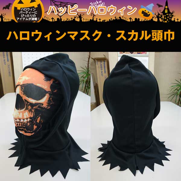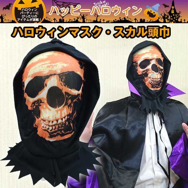 かぼちゃ色したスカル。すっぽりかぶるとやっぱり怖い!マントなどと合わせるとグッドです!