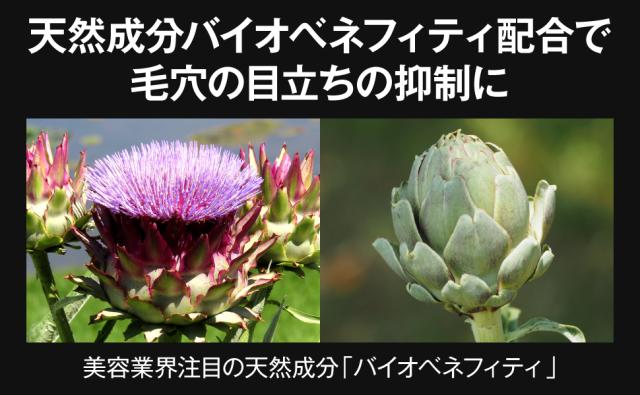 皮膚弾力改善やメラノサイト(シミの元)の増殖抑制や、毛穴のたるみや黒ずみの改善などに期待が持たれている天然成分「バイオベネフィティ」を配合しています。