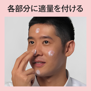 適量を清潔な手に取り、おでこ→あご→両頬→鼻の頭に順番で付けていき、薄く伸ばします。